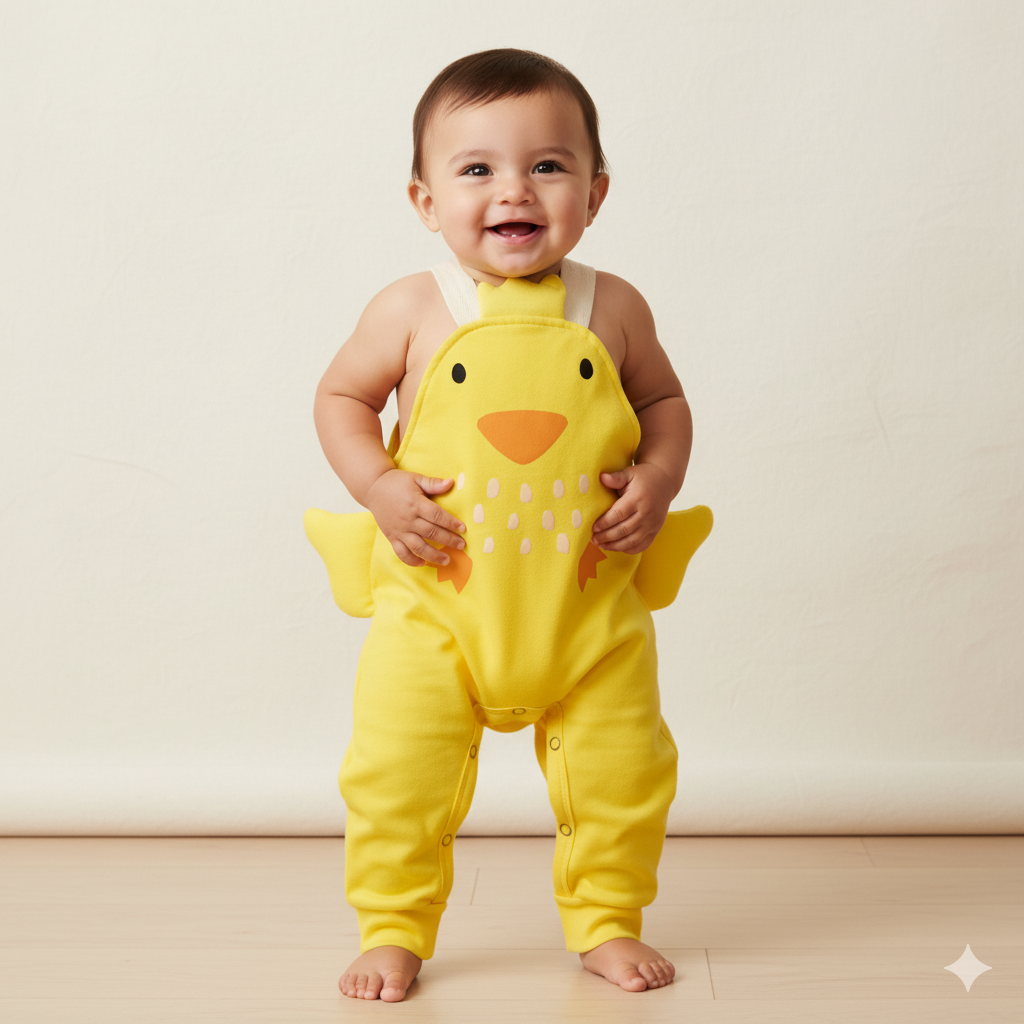 Ternura que salta a la vista Nuestro overol de pollito llega con detalles que derriten: alas suaves, capucha con pico y una textura tan cómoda que tu peque no querrá quitárselo. Perfecto para jugar, dormir o crear un disfraz adorable sin esfuerzo.