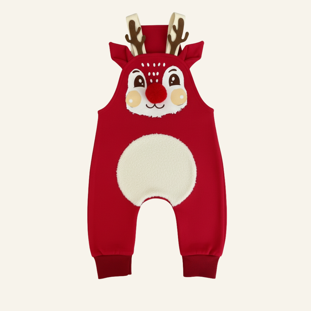 Nuestro overol de reno es perfecto para llenar de magia y calidez esta temporada. Su textura suave, capucha con cuernitos y detalles encantadores harán que tu peque sea el más adorable del lugar.